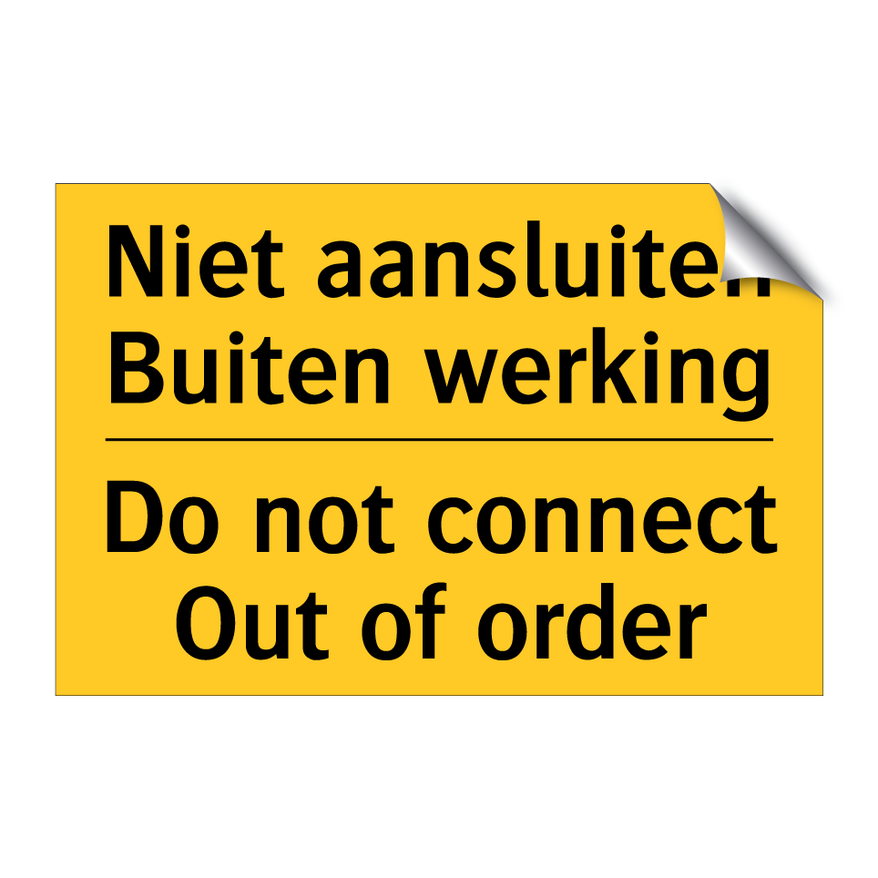 Dit waarschuwingsbord is ideaal voor gebruik in situaties waar apparatuur buiten werking is en niet mag worden aangesloten. De opvallende gele achtergrond met zwarte tekst zorgt ervoor dat de boodschap duidelijk en direct zichtbaar is. Dankzij de tweetalige tekst in zowel Nederlands als Engels, is dit bordje perfect voor internationale omgevingen zoals luchthavens, havens, en grensovergangen. Plaats dit bordje bij defecte machines, elektrische installaties of andere apparatuur die tijdelijk niet gebruikt mag worden. Het waarschuwingsbord helpt ongelukken te voorkomen en zorgt voor een veilige werkomgeving.