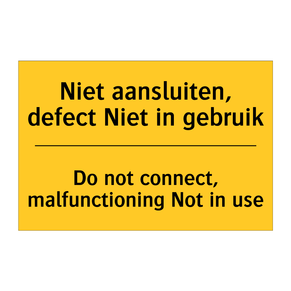 Waarschuwingsbord met de tekst Niet aansluiten, defect Niet in gebruik / Do not connect, malfunctioning Not in use