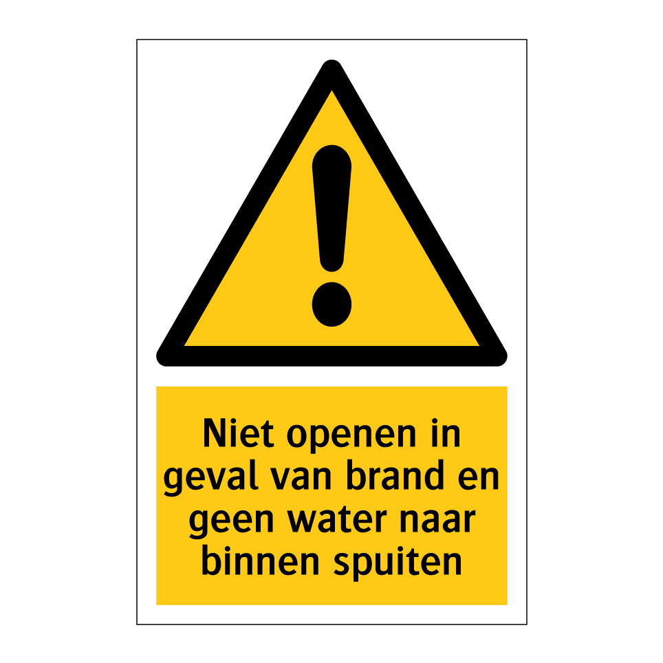 Waarschuwingsbord met de tekst Niet openen in geval van brand en geen water naar binnen spuiten