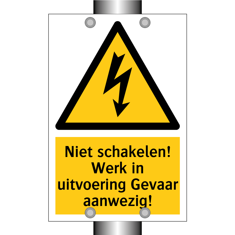 Waarschuwingsbord met de tekst Niet schakelen! Werk in uitvoering Gevaar aanwezig!