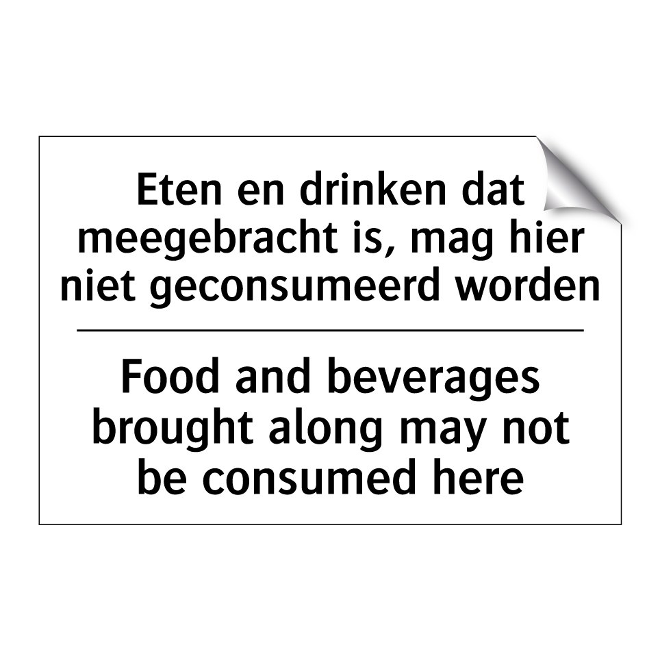 Verbodsbord met de tekst Eten en drinken dat meegebracht is, mag hier niet geconsumeerd worden en in het Engels: Food and beverages brought along may not be consumed here