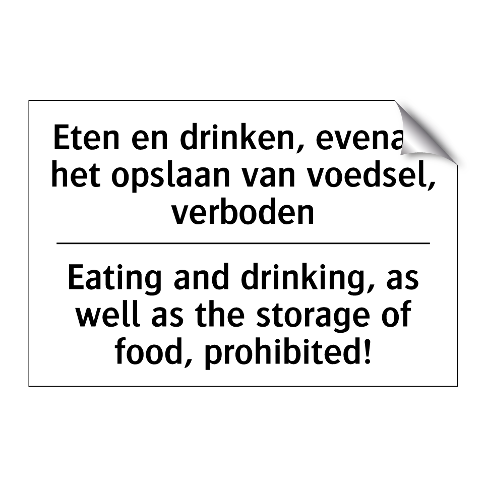 Verbodsbord met de tekst Eten en drinken, evenals het opslaan van voedsel, verboden en in het Engels: Eating and drinking, as well as the storage of food, prohibited!