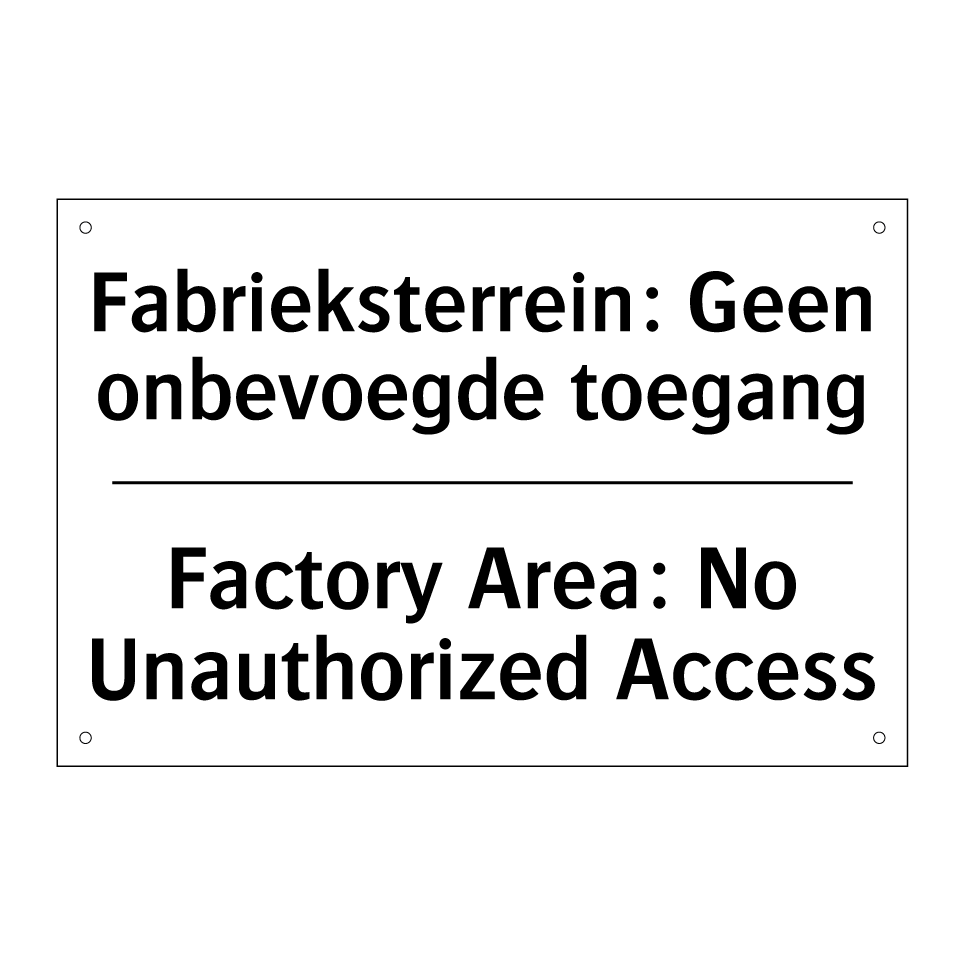 Verbodsbord met de tekst Fabrieksterrein: Geen onbevoegde toegang en in het Engels: Factory Area: No Unauthorized Access
