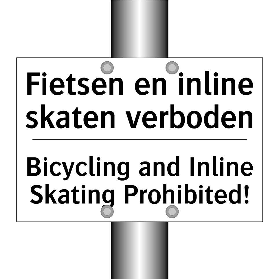 Verbodsbord met de tekst Fietsen en inline skaten verboden en in het Engels: Bicycling and Inline Skating Prohibited!