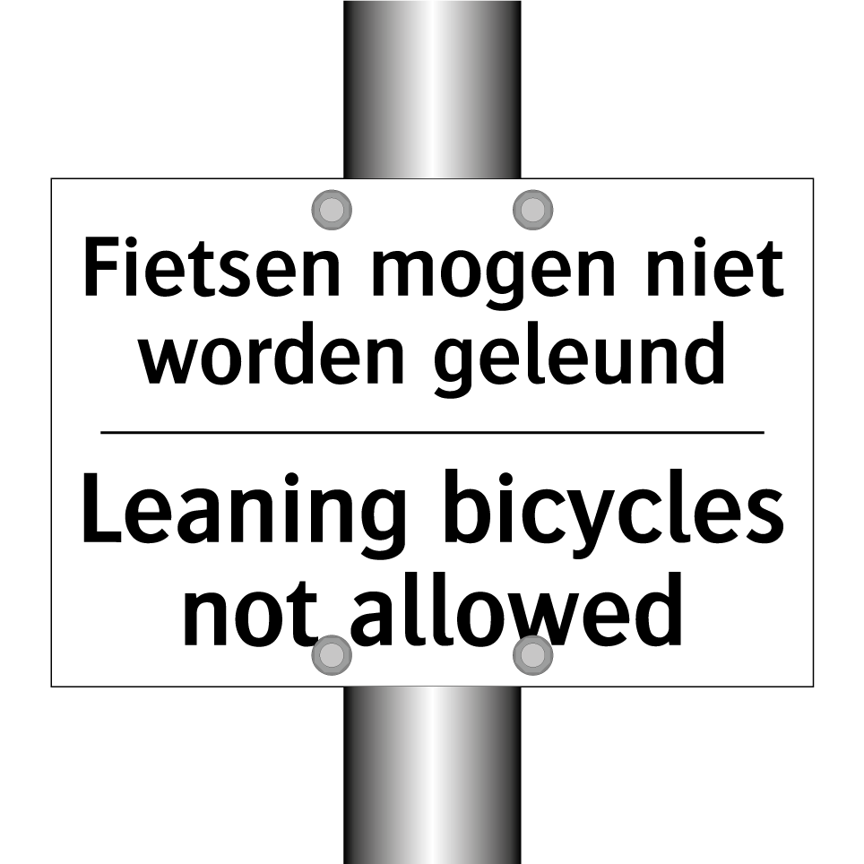 Verbodsbord met de tekst Fietsen mogen niet worden geleund en in het Engels: Leaning bicycles not allowed