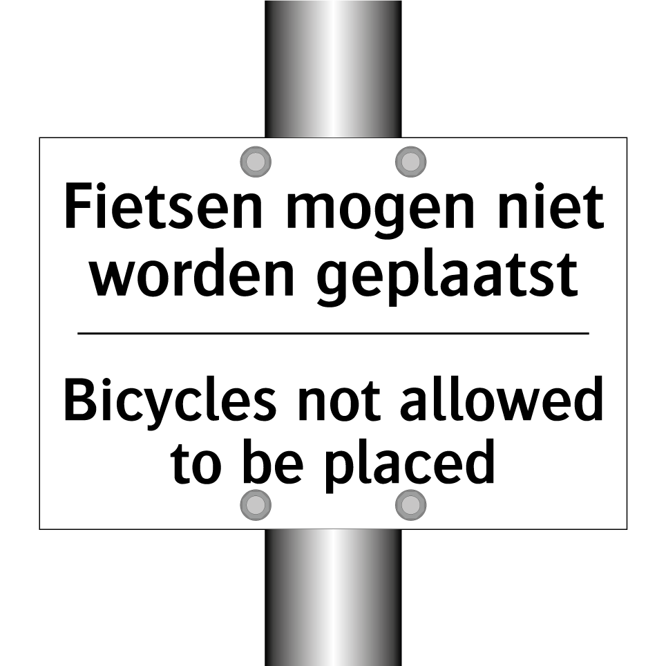 Verbodsbord met de tekst Fietsen mogen niet worden geplaatst en in het Engels: Bicycles not allowed to be placed