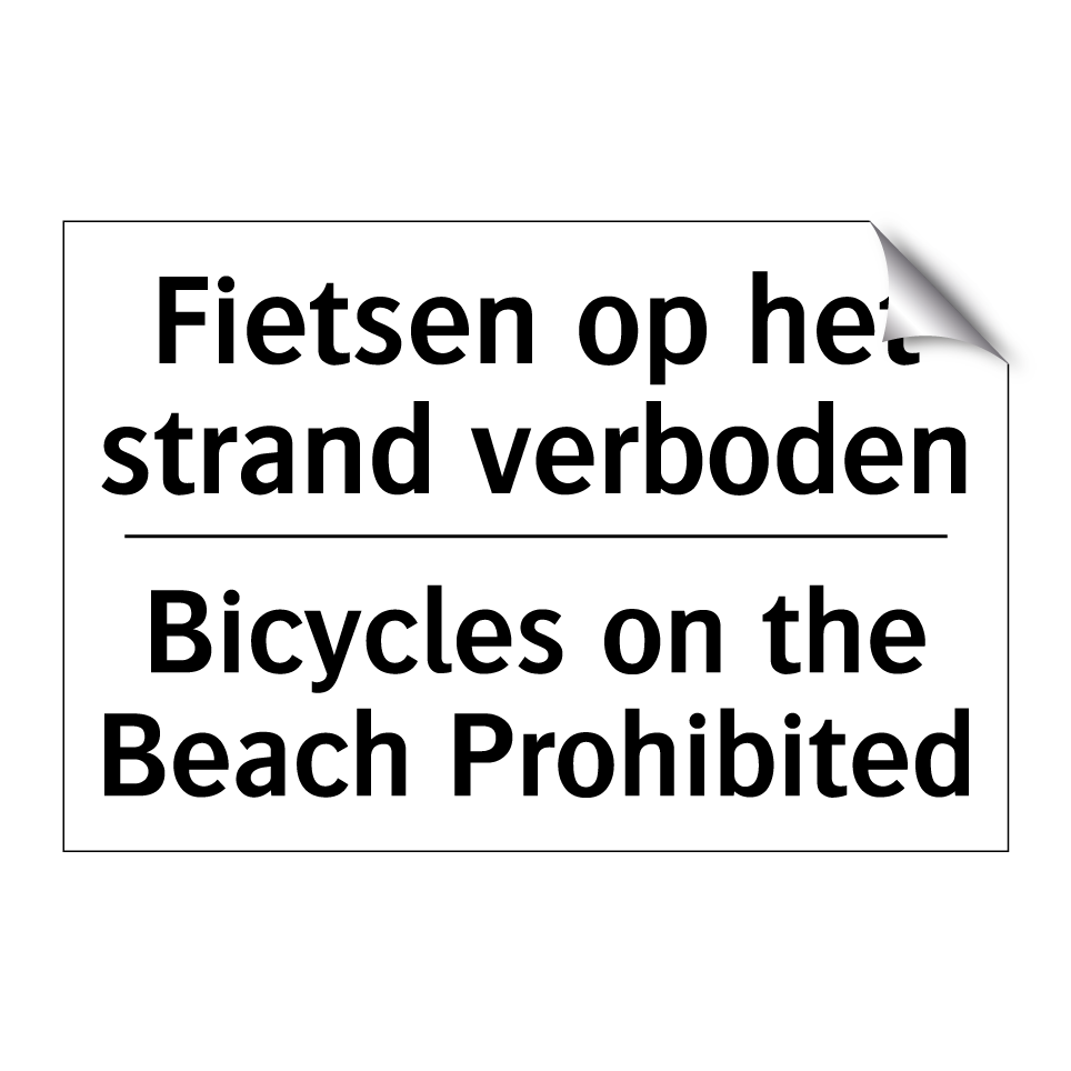 Verbodsbord met de tekst Fietsen op het strand verboden en in het Engels: Bicycles on the Beach Prohibited