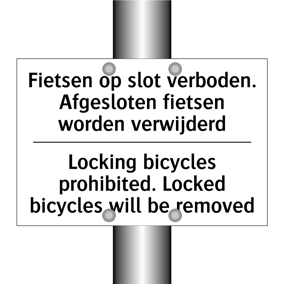 Verbodsbord met de tekst Fietsen op slot verboden. Afgesloten fietsen worden verwijderd en in het Engels: Locking bicycles prohibited. Locked bicycles will be removed