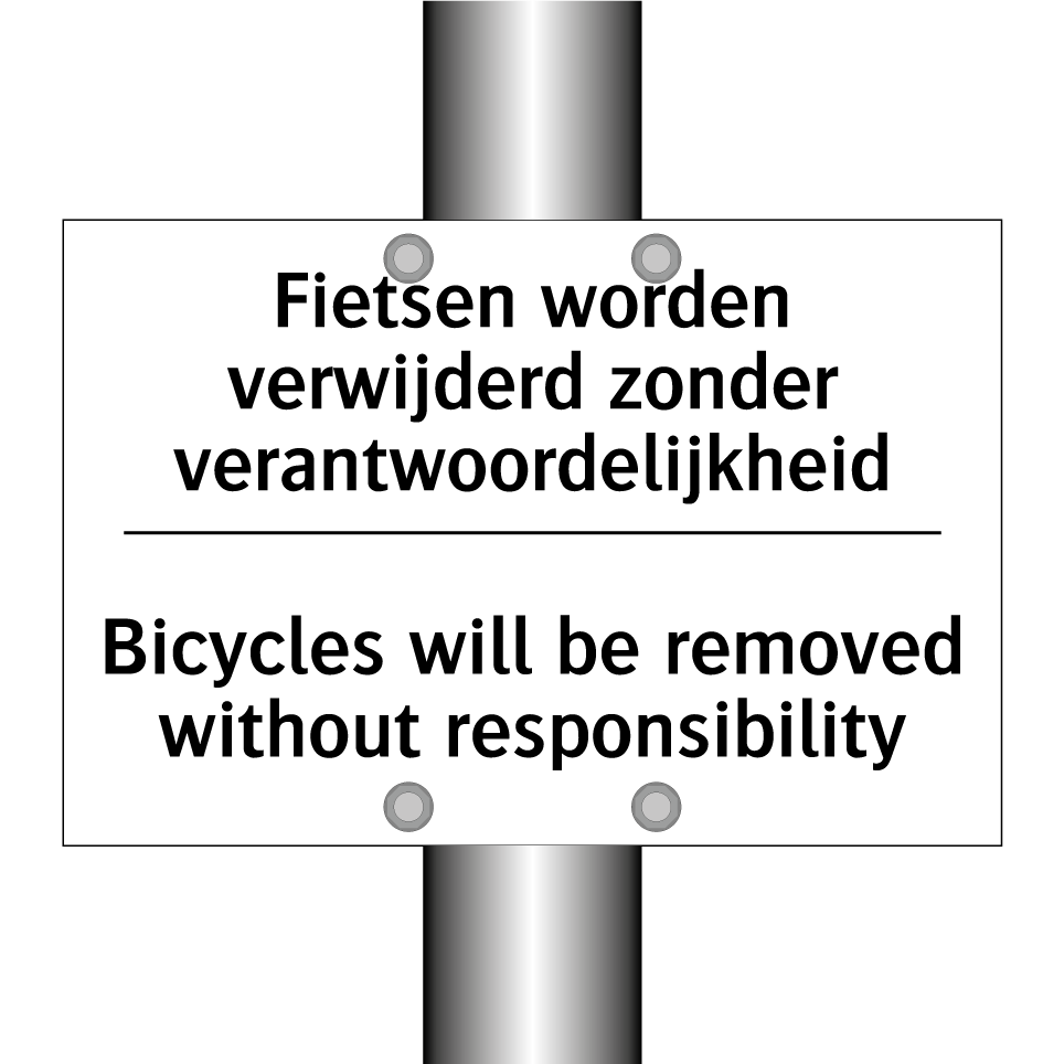 Verbodsbord met de tekst Fietsen worden verwijderd zonder verantwoordelijkheid en in het Engels: Bicycles will be removed without responsibility