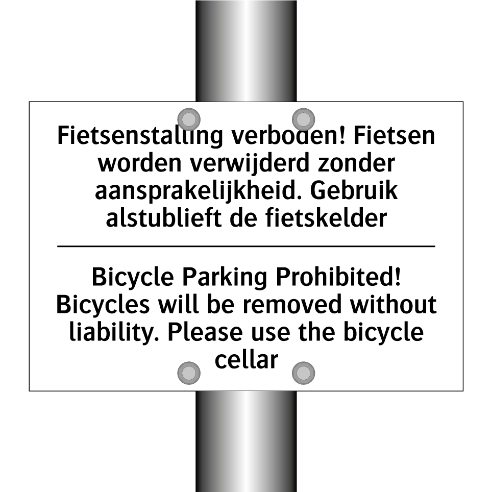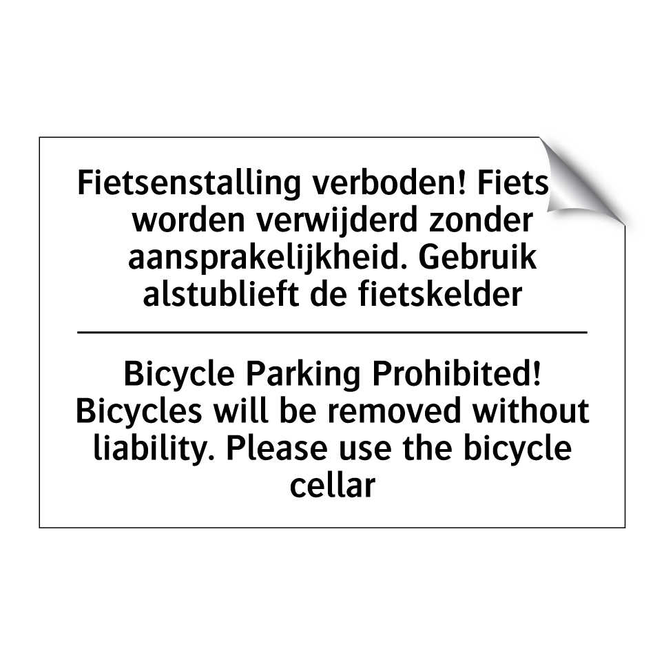 Verbodsbord met de tekst Fietsenstalling verboden! Fietsen worden verwijderd zonder aansprakelijkheid. Gebruik alstublieft de fietskelder en in het Engels: Bicycle Parking Prohibited! Bicycles will be removed without liability. Please use the bicycle cellar