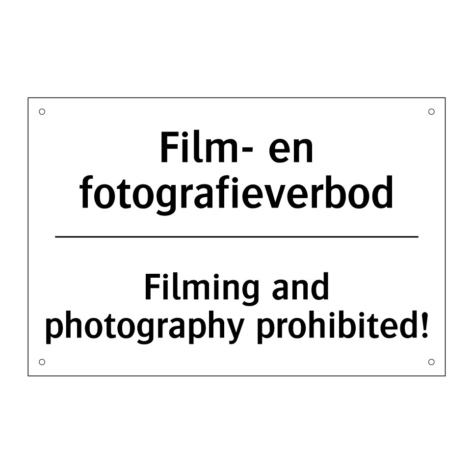 Verbodsbord met de tekst Film- en fotografieverbod en in het Engels: Filming and photography prohibited!