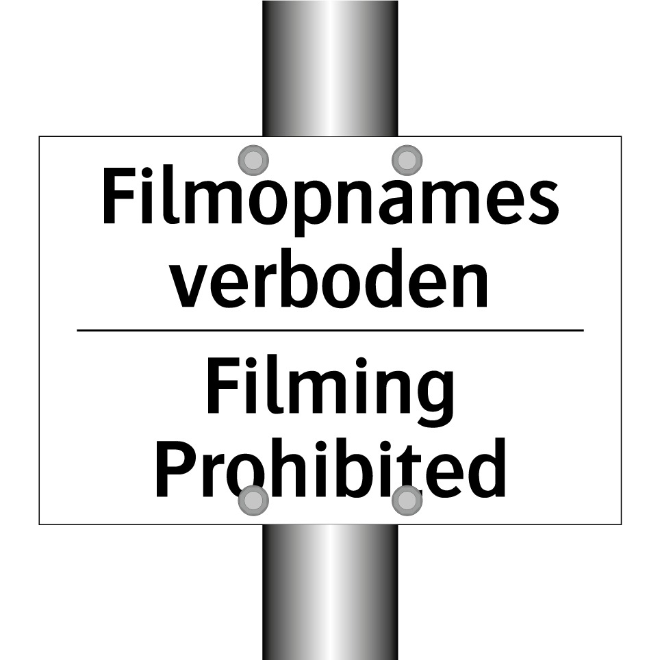 Verbodsbord met de tekst Filmopnames verboden en in het Engels: Filming Prohibited