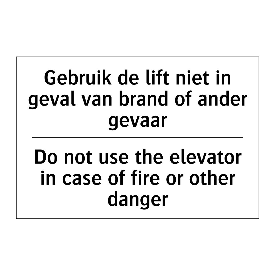 Verbodsbord met de tekst Gebruik de lift niet in geval van brand of ander gevaar en in het Engels: Do not use the elevator in case of fire or other danger