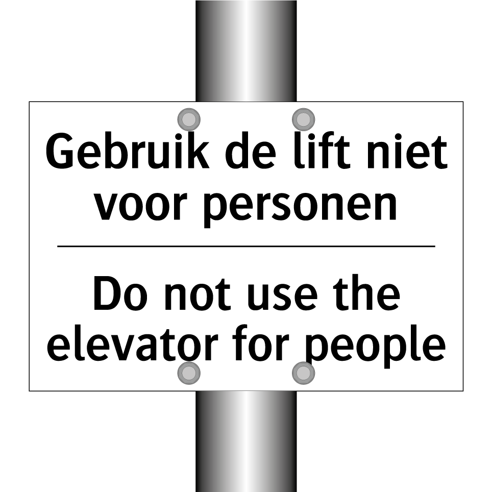 Verbodsbord met de tekst Gebruik de lift niet voor personen en in het Engels: Do not use the elevator for people