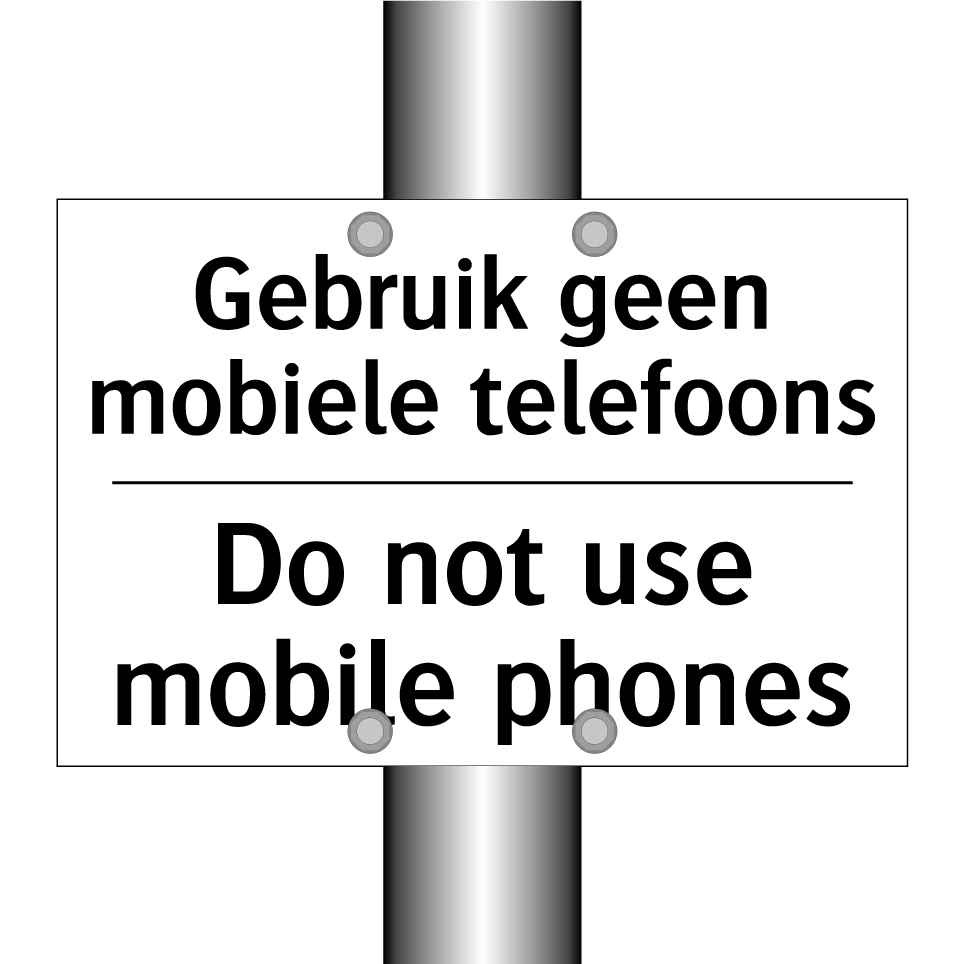 Verbodsbord met de tekst Gebruik geen mobiele telefoons en in het Engels: Do not use mobile phones