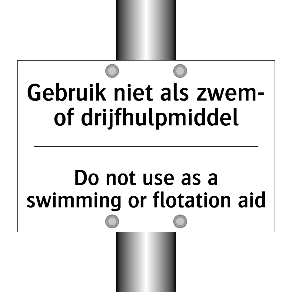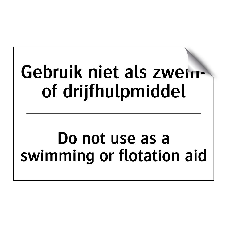 Verbodsbord met de tekst Gebruik niet als zwem- of drijfhulpmiddel en in het Engels: Do not use as a swimming or flotation aid