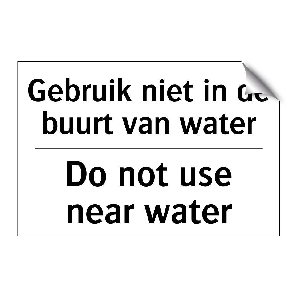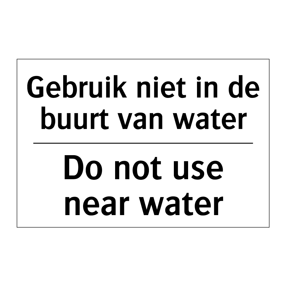 Verbodsbord met de tekst Gebruik niet in de buurt van water en in het Engels: Do not use near water