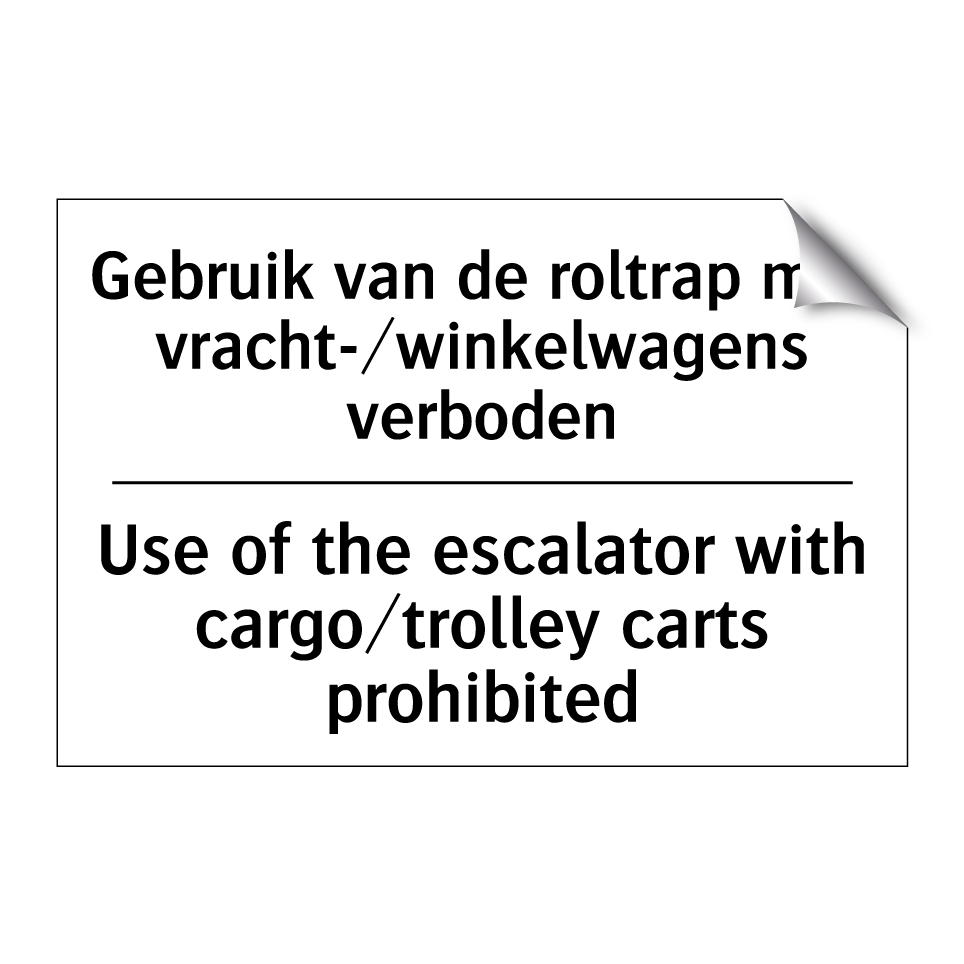 Verbodsbord met de tekst Gebruik van de roltrap met vracht-/winkelwagens verboden en in het Engels: Use of the escalator with cargo/trolley carts prohibited