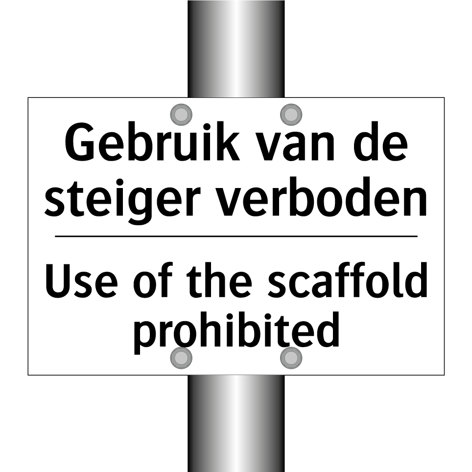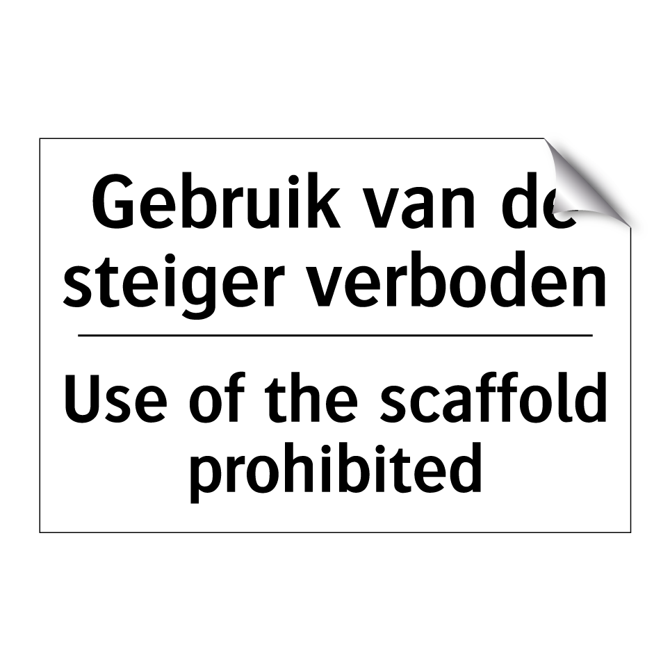 Verbodsbord met de tekst Gebruik van de steiger verboden en in het Engels: Use of the scaffold prohibited