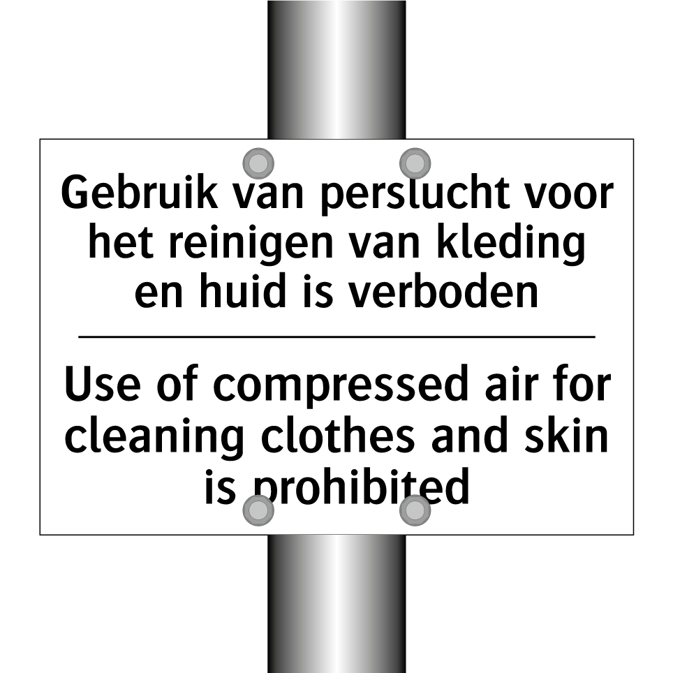 Verbodsbord met de tekst Gebruik van perslucht voor het reinigen van kleding en huid is verboden en in het Engels: Use of compressed air for cleaning clothes and skin is prohibited