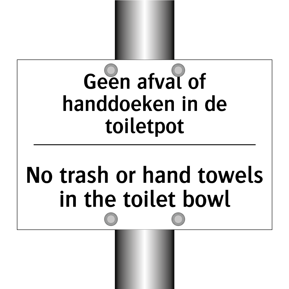 Verbodsbord met de tekst Geen afval of handdoeken in de toiletpot en in het Engels: No trash or hand towels in the toilet bowl