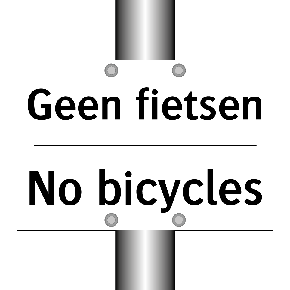 Verbodsbord met de tekst Geen fietsen en in het Engels: No bicycles