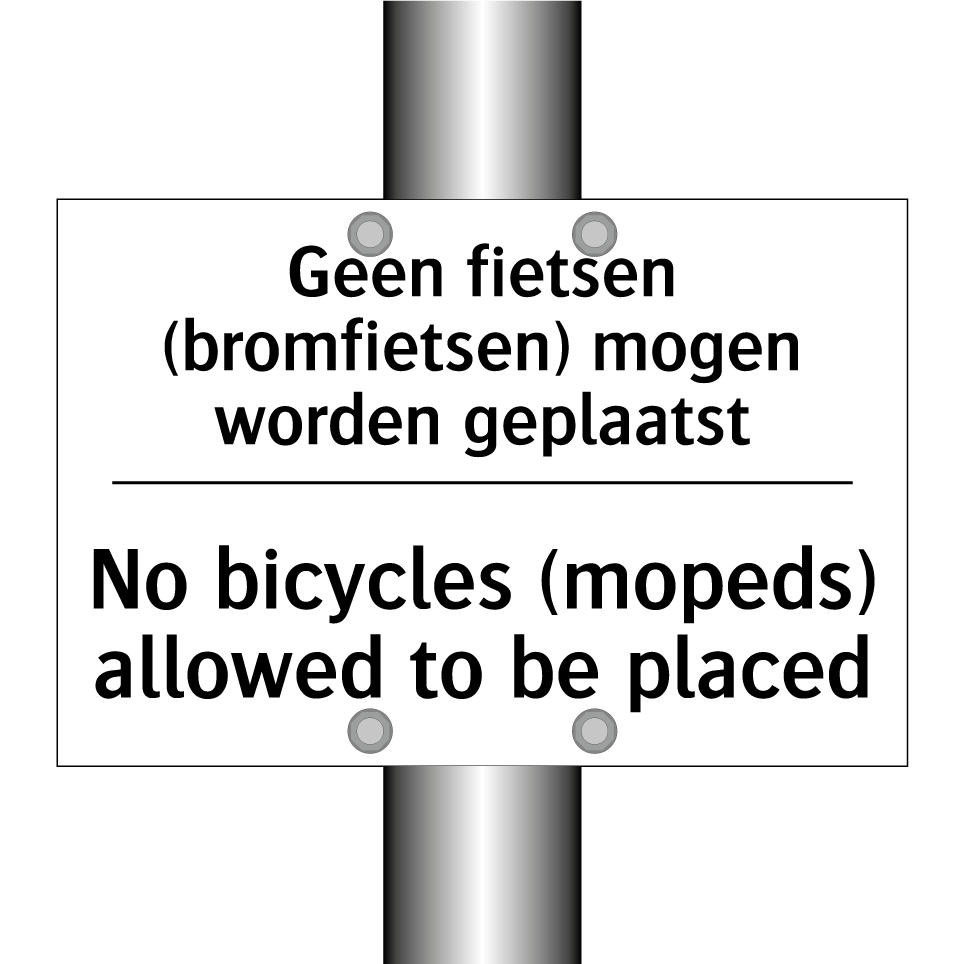 Verbodsbord met de tekst Geen fietsen (bromfietsen) mogen worden geplaatst en in het Engels: No bicycles (mopeds) allowed to be placed