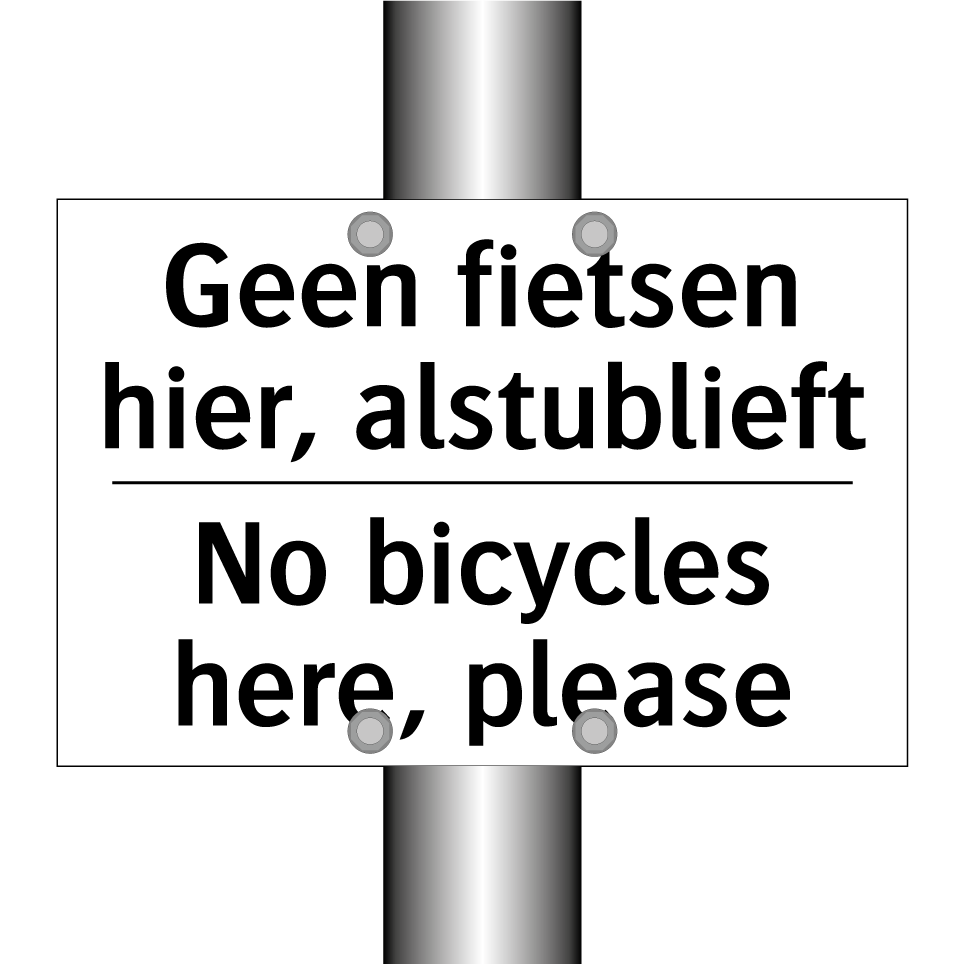 Verbodsbord met de tekst Geen fietsen hier, alstublieft en in het Engels: No bicycles here, please