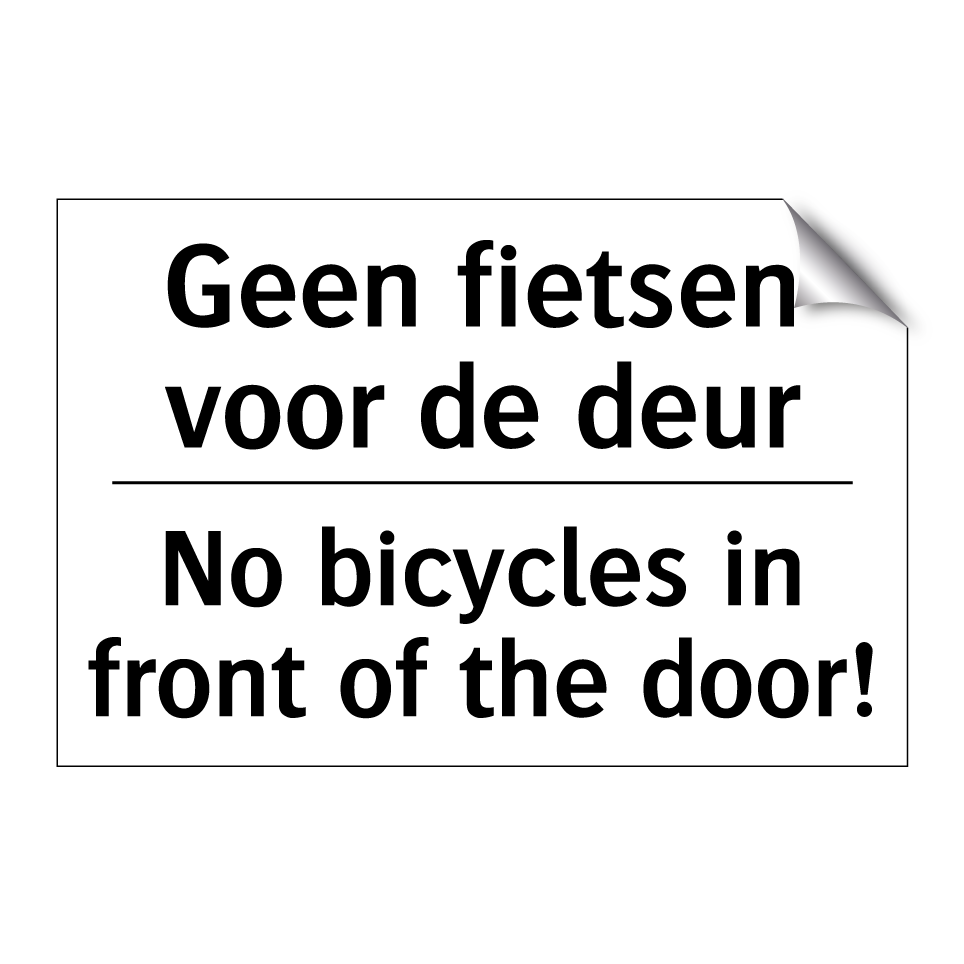 Verbodsbord met de tekst Geen fietsen voor de deur en in het Engels: No bicycles in front of the door!