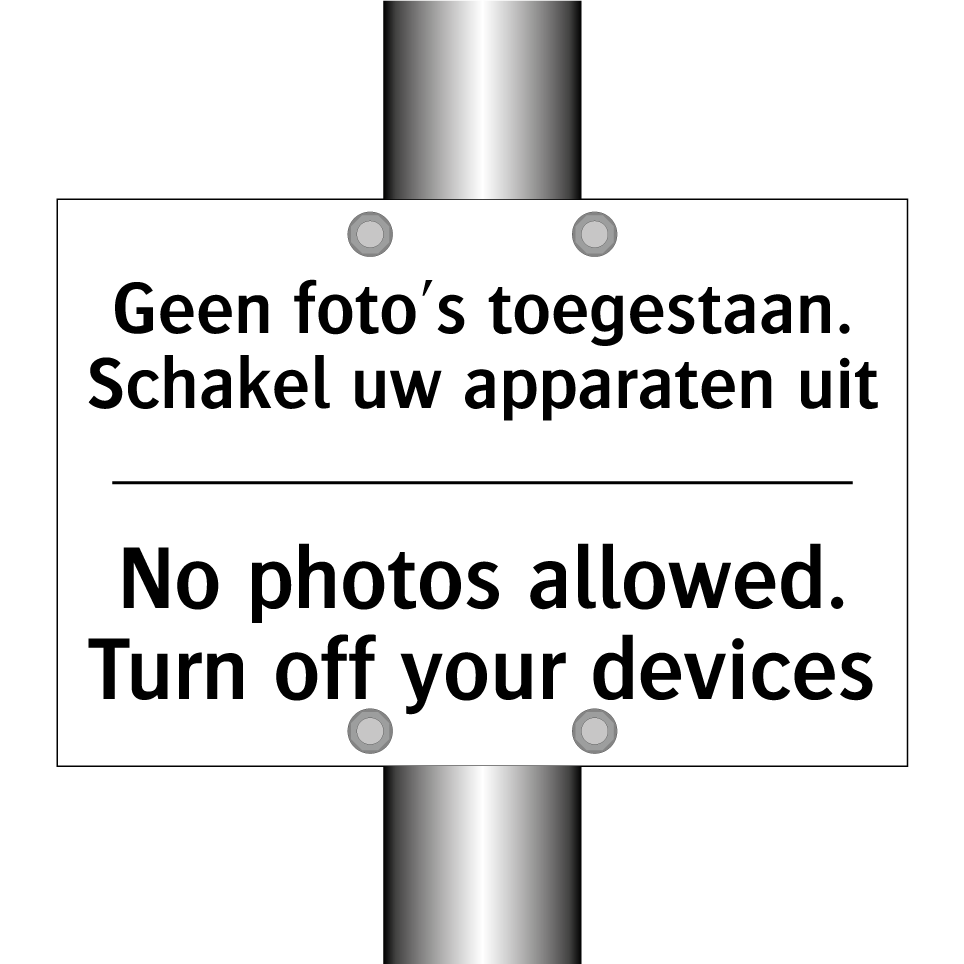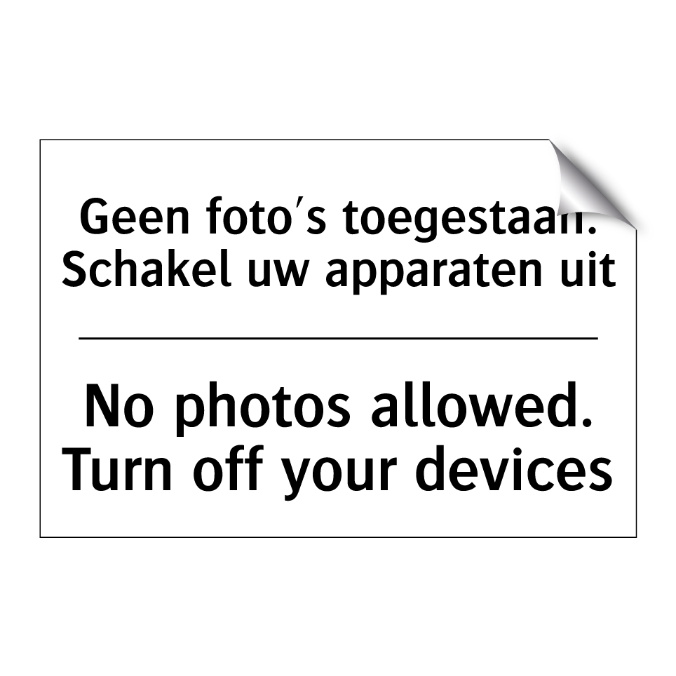 Verbodsbord met de tekst Geen foto's toegestaan. Schakel uw apparaten uit en in het Engels: No photos allowed. Turn off your devices
