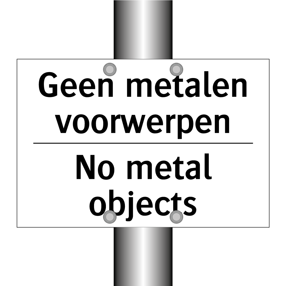 Verbodsbord met de tekst Geen metalen voorwerpen en in het Engels: No metal objects