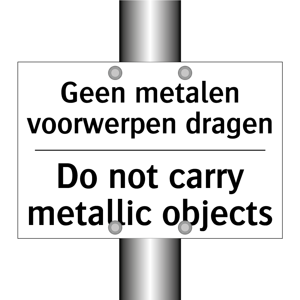 Verbodsbord met de tekst Geen metalen voorwerpen dragen en in het Engels: Do not carry metallic objects