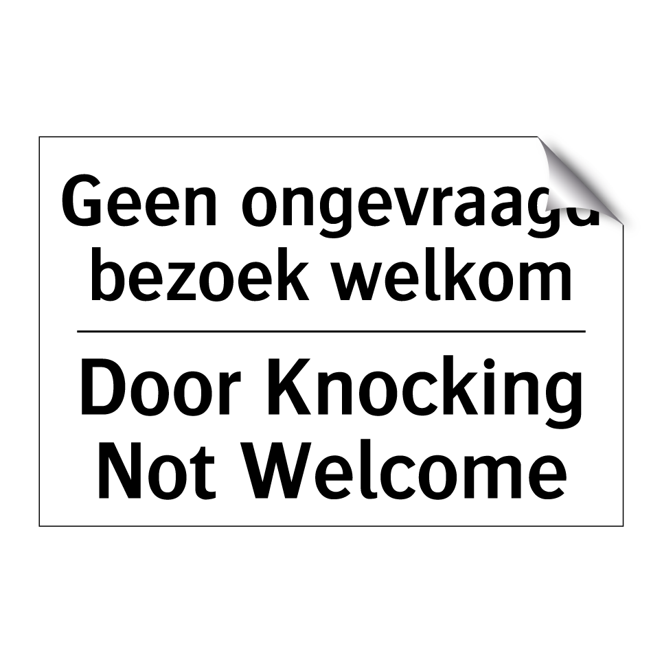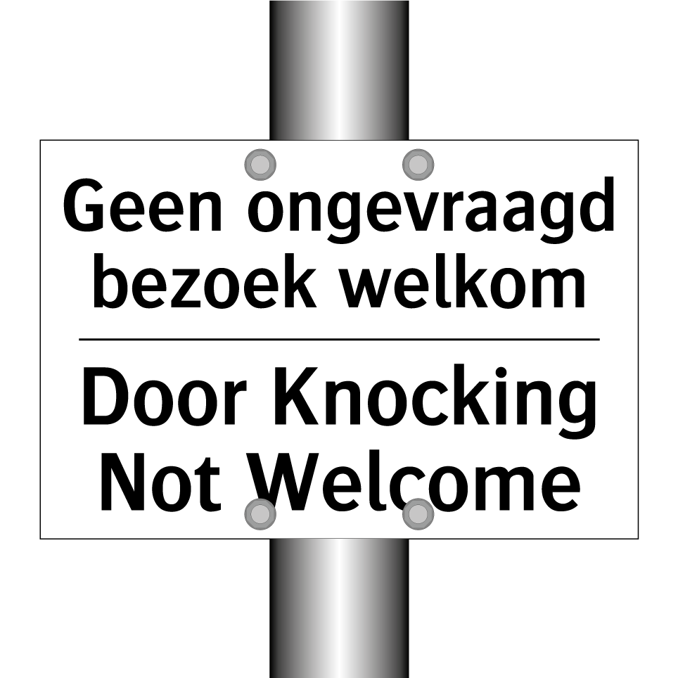 Verbodsbord met de tekst Geen ongevraagd bezoek welkom en in het Engels: Door Knocking Not Welcome