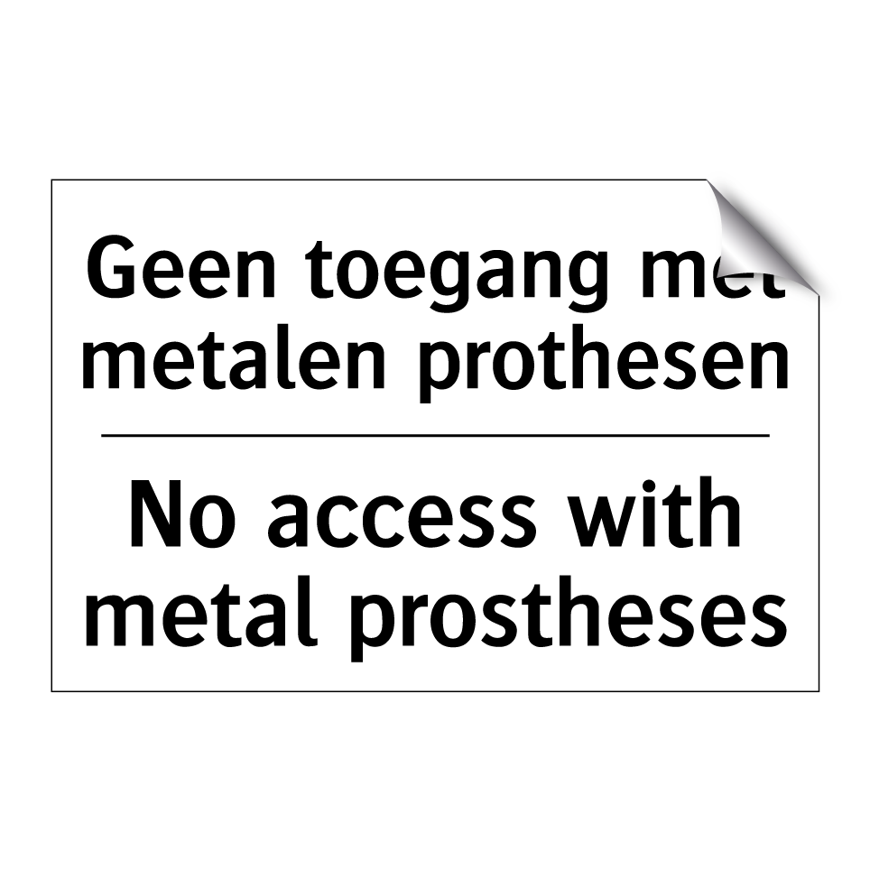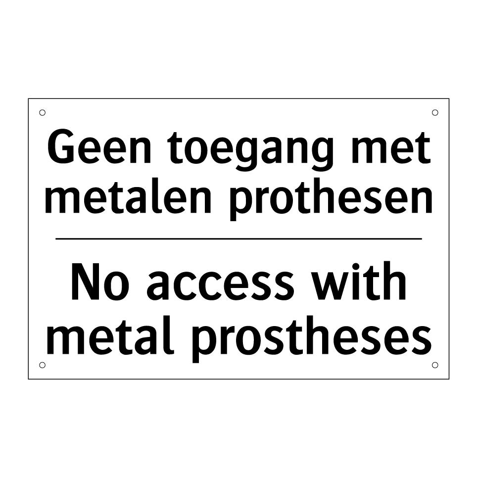 Verbodsbord met de tekst Geen toegang met metalen prothesen en in het Engels: No access with metal prostheses