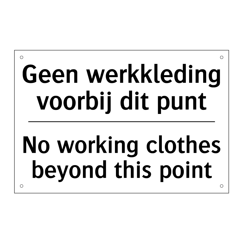 Verbodsbord met de tekst Geen werkkleding voorbij dit punt en in het Engels: No working clothes beyond this point