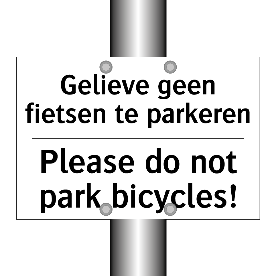 Verbodsbord met de tekst Gelieve geen fietsen te parkeren en in het Engels: Please do not park bicycles!