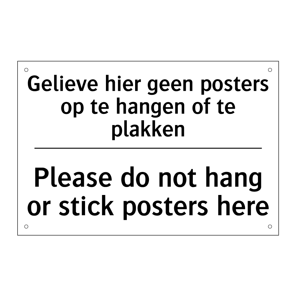 Verbodsbord met de tekst Gelieve hier geen posters op te hangen of te plakken en in het Engels: Please do not hang or stick posters here