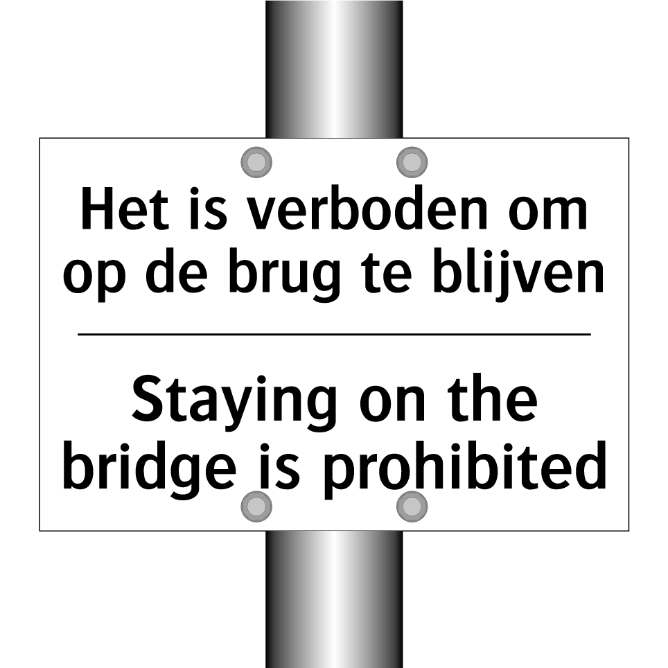 Verbodsbord met de tekst Het is verboden om op de brug te blijven en in het Engels: Staying on the bridge is prohibited