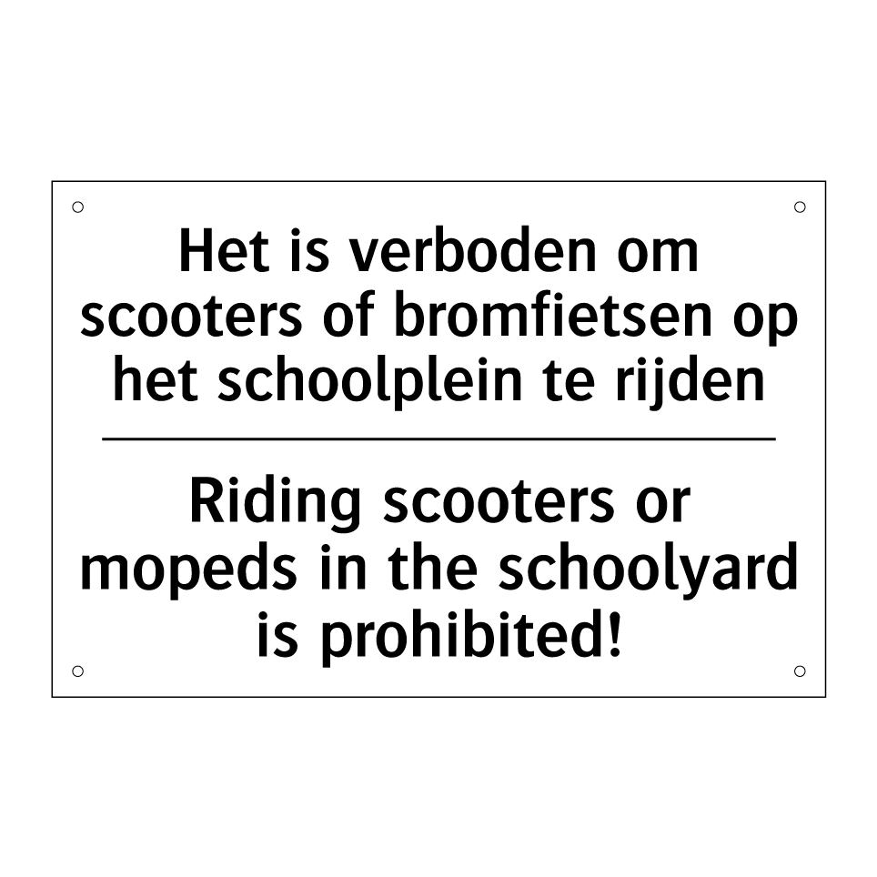 Deze verbodsbord is een essentiële toevoeging voor elke schoolomgeving. Met duidelijke instructies in zowel het Nederlands als het Engels, zorgt deze bord ervoor dat iedereen, ongeacht hun taalachtergrond, de regels begrijpt. Het is ideaal voor plaatsing op schoolpleinen om de veiligheid van kinderen te waarborgen door het gebruik van scooters en bromfietsen te verbieden. Door de tweetalige tekst is het bord toegankelijk voor een breder publiek, wat bijdraagt aan een veilige en ordelijke omgeving. Plaats deze bord op strategische locaties zoals ingangen en uitgangen van het schoolterrein om maximale zichtbaarheid en naleving te garanderen.