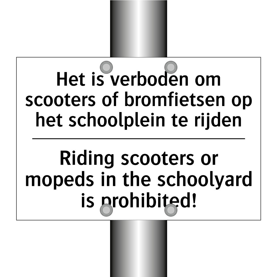 Verbodsbord met de tekst Het is verboden om scooters of bromfietsen op het schoolplein te rijden en in het Engels: Riding scooters or mopeds in the schoolyard is prohibited!