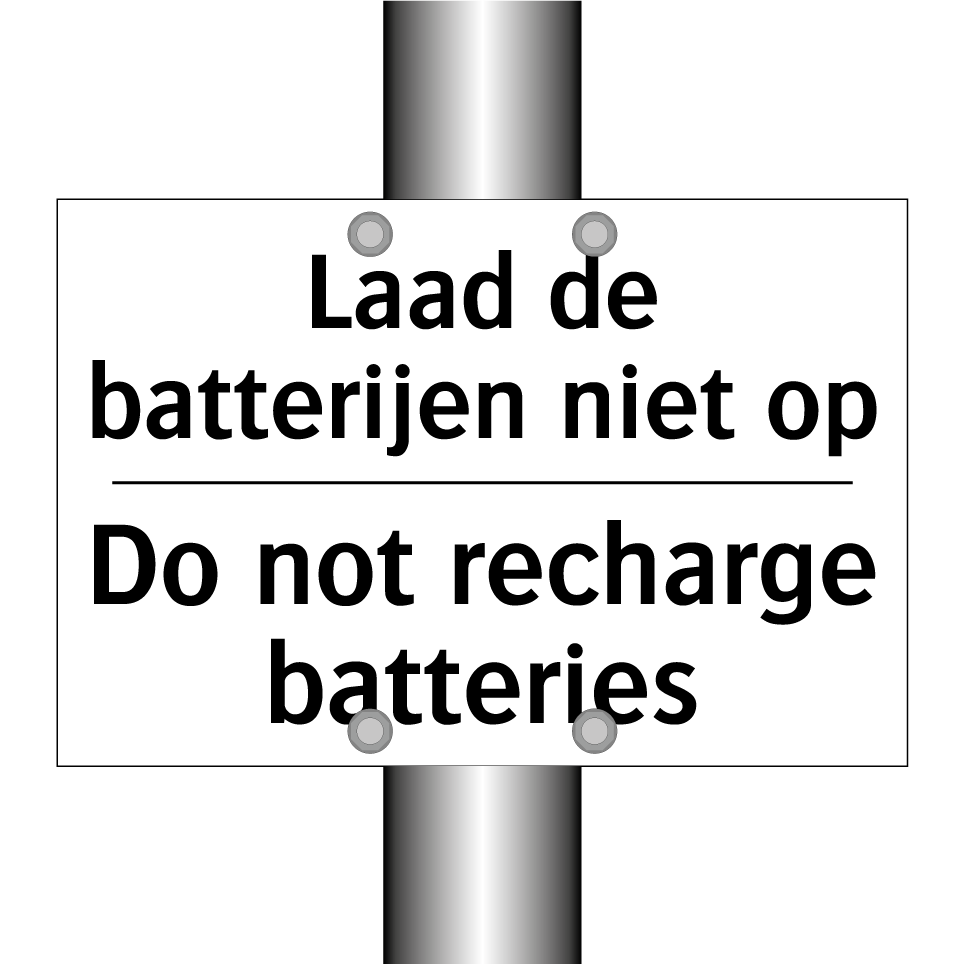 Verbodsbord met de tekst Laad de batterijen niet op en in het Engels: Do not recharge batteries