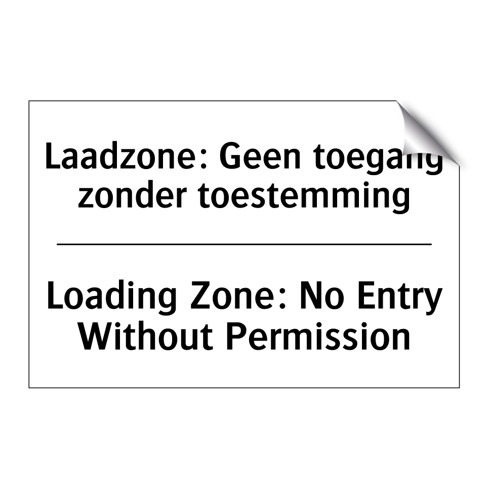 Verbodsbord met de tekst Laadzone: Geen toegang zonder toestemming en in het Engels: Loading Zone: No Entry Without Permission