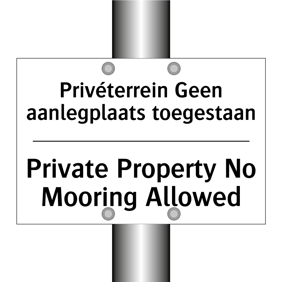 Verbodsbord met de tekst Privéterrein Geen aanlegplaats toegestaan en in het Engels: Private Property No Mooring Allowed