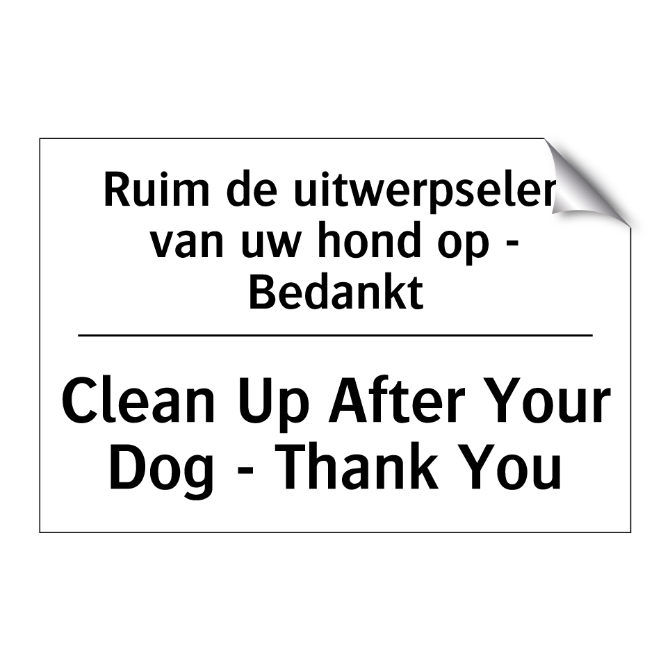 Verbodsbord met de tekst Ruim de uitwerpselen van uw hond op - Bedankt en in het Engels: Clean Up After Your Dog - Thank You