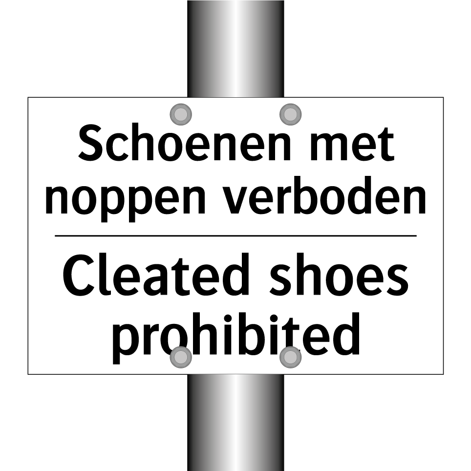 Verbodsbord met de tekst Schoenen met noppen verboden en in het Engels: Cleated shoes prohibited
