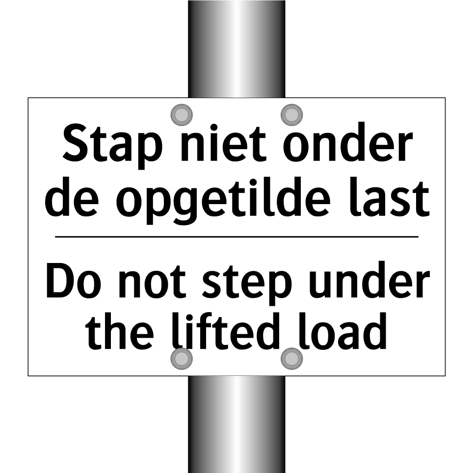 Verbodsbord met de tekst Stap niet onder de opgetilde last en in het Engels: Do not step under the lifted load