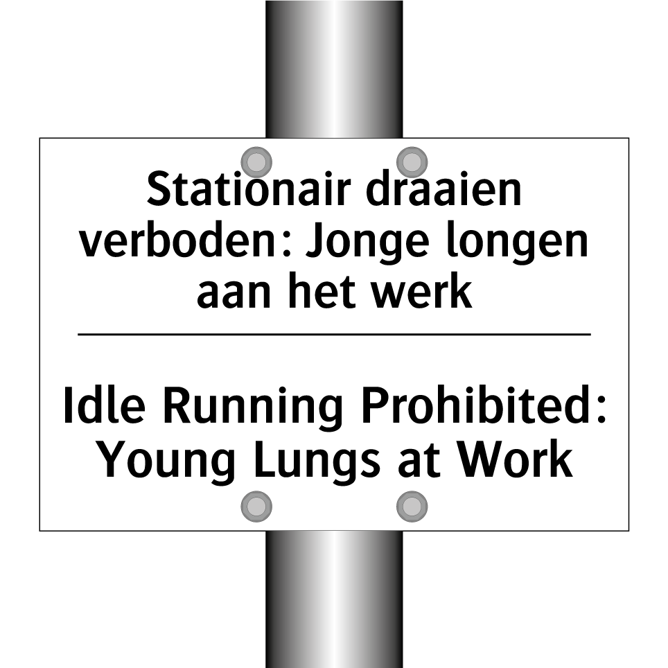 Verbodsbord met de tekst Stationair draaien verboden: Jonge longen aan het werk en in het Engels: Idle Running Prohibited: Young Lungs at Work