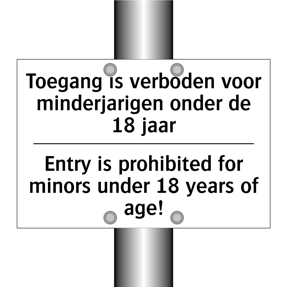 Verbodsbord met de tekst Toegang is verboden voor minderjarigen onder de 18 jaar en in het Engels: Entry is prohibited for minors under 18 years of age!