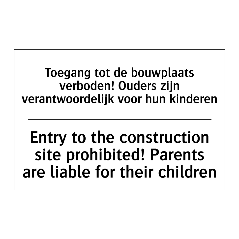 Verbodsbord met de tekst Toegang tot de bouwplaats verboden! Ouders zijn verantwoordelijk voor hun kinderen en in het Engels: Entry to the construction site prohibited! Parents are liable for their children