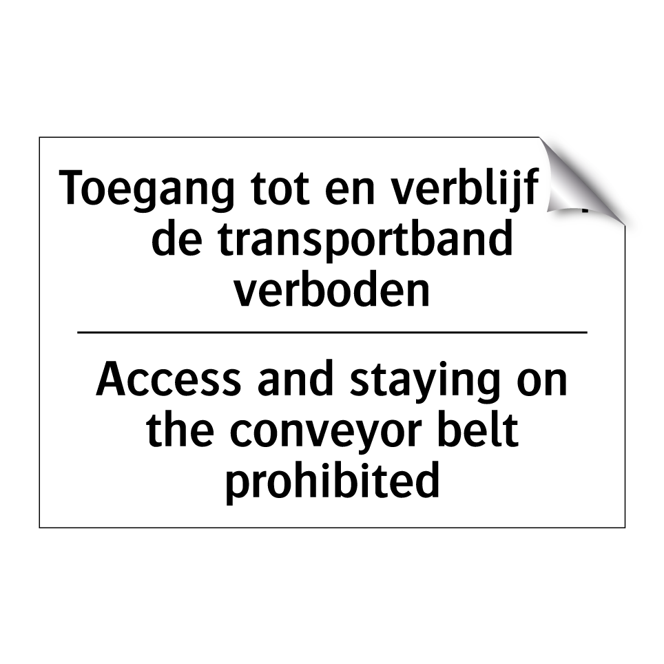 Verbodsbord met de tekst Toegang tot en verblijf op de transportband verboden en in het Engels: Access and staying on the conveyor belt prohibited